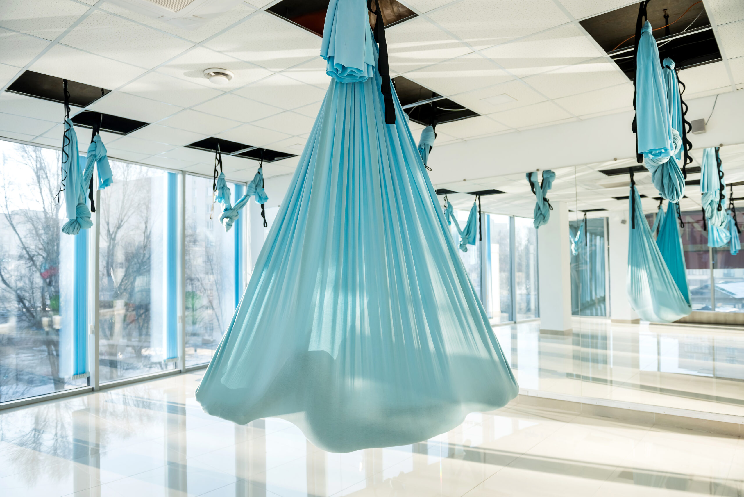 天井から吊るした柔らかな布に体を少しずつゆだねながら、ヨガの動きを取り入れて行うのがエアリアルヨガ(空中ヨガ)です。